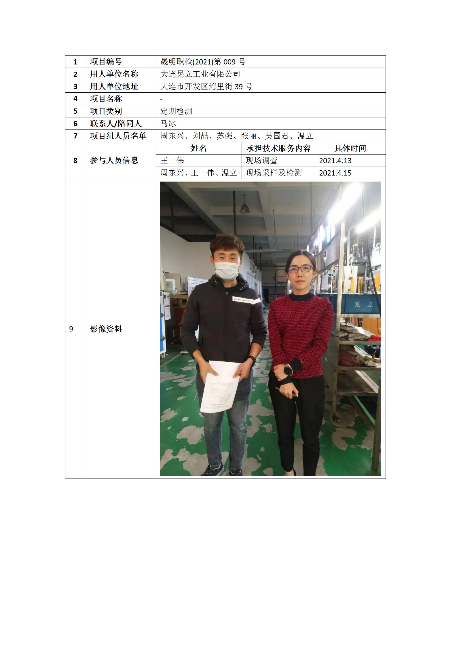 晟明职检(2021)第009号 大连晃立工业有限公司